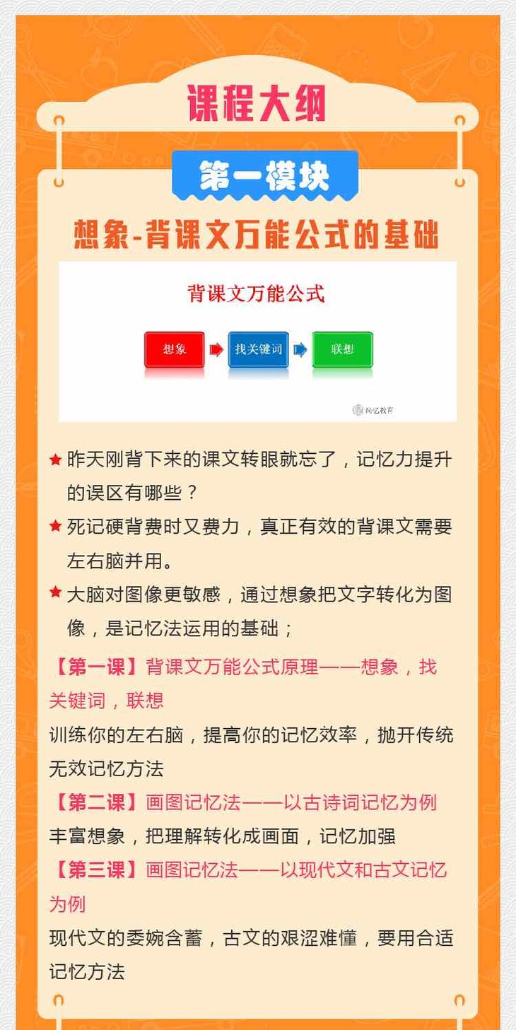 身为家长,您是否有这样的困惑: 堆积如山的课文需要背诵,背完的第二天忘得七七八八,怎么办...... 背完的课文又忘记,考试时不会活学活用...... 孩子花费了大量时间死记硬背,效率不高,学习没有动力...... 背课文有万能公式,用对方法,训练大脑,能让你的记忆快人十倍!